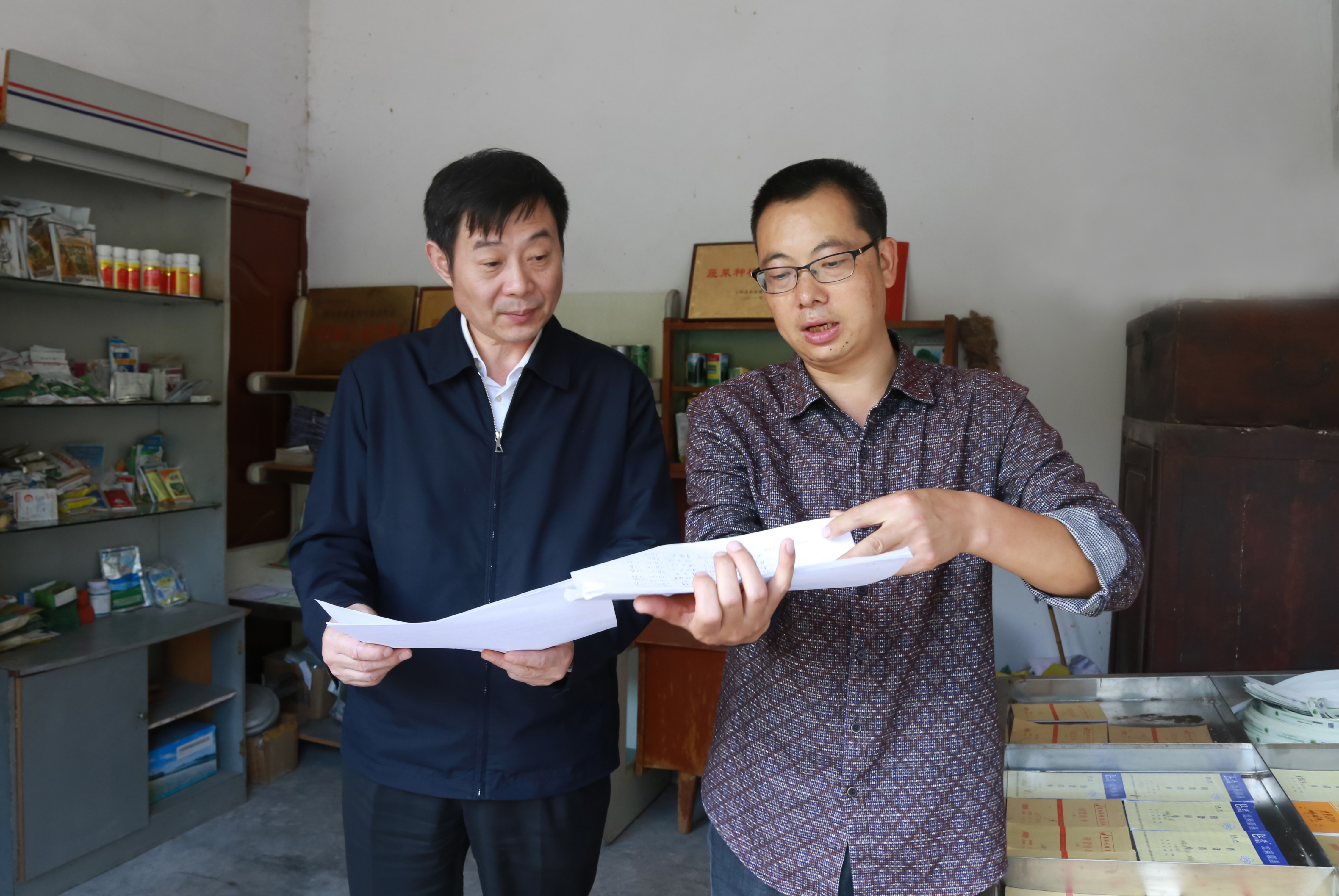 会前,县人大常委会主任赵勇(左)在青龙街道马沱村蔬菜基地库房查看农业投入品使用登记情况。